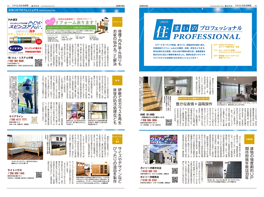 06-08P | [住まいのプロフェッショナル2025]住まいづくりやライフスタイルのヒントに! 沖縄県内の企業8社が提案 ①HAND IN HAND(有限会社 ヨシダ工業サービス) ②ガイソー沖縄中央店 ガイソー沖縄南店 ③株式会社 エム・システム沖縄 ④クリアライン ⑤ライトハウス ⑥有限会社 繁樹園 ⑦スリースターズ 株式会社 ⑧興産アメニティ 株式会社 |