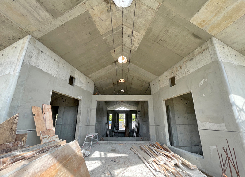 型枠解体後、パティオから建物内部を見る。外部と内部に連続した屋根が空間を一体にしている