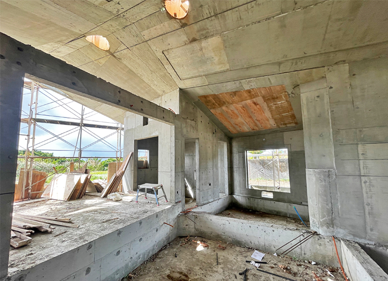 Aさんの家は大開口の窓を使うことで明るく開放的な建物だが、大開口の採用は通常の窓より安全性に配慮するため、サッシやガラスの強度に注意する必要がある。沖縄では風速46メートルの風に耐えることが一般的な強度基準だが、私たちは過去に宮古島の台風で観測された最大風速85メートルを基準とし、サッシには補強材を入れ、厚いガラスを使用することで強度を高める対策をしている。今回の現場で一番大きなガラスは大きさが約3平方メートル、厚みは15ミリ、重量は120キロ弱である。サッシとガラスを入れたおさまる総合建材の奥平誠代表は「この建物がどう仕上がるのか完成が楽しみで」と取り付けた後も頻繁に現場を見に来ていた。