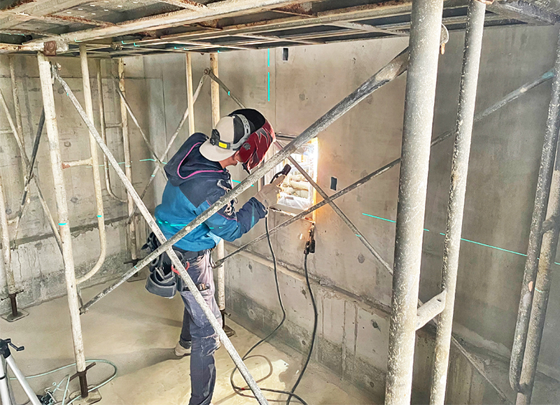 アルミサッシの取り付けの様子。レーザーで傾きや位置を確認し、溶接して固定する