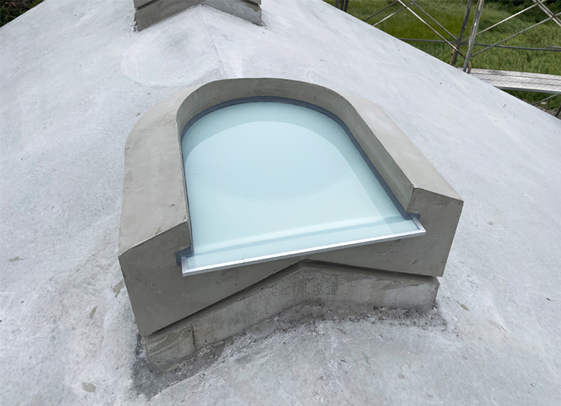 トップライトに取り付けられたガラス。飛散防止のため外部には透明、内部には乳白色のフィルムを貼った