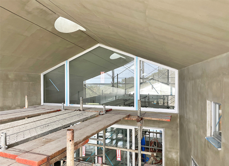 次に、内部足場を組んでアルサッシを取り付け、ガラスを入れて雨仕舞い(内部に雨水が浸入しないように防水処理をする)の工事が進む。サッシなどの開口部は単に明かり取りや、通風のためだけではなく、建物の外観や内部からの見え方、部屋の広さや天井の高さも踏まえて大きさや位置、形状を決めている。