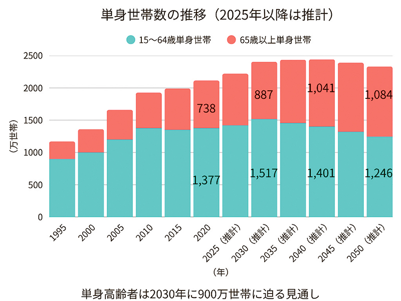 総務省「国勢調査」(2020年)によれば、単身世帯は全体の38%に達し、過去最高を更新しています。単身高齢者を受け入れざるを得ない現状で、高齢化や核家族化で保証人を頼める親族がいない人が増えています。