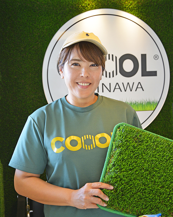 自社開発の冷却人工芝を提供する(株)COOOL 沖縄オフィスの宮良ゆかりさん(43)。「私たちが手がけた公園の芝で、子どもたちがはだしになって遊ぶのを見るのが好き。そんな場所をもっと増やしたい」と優しい母の表情を見せる。