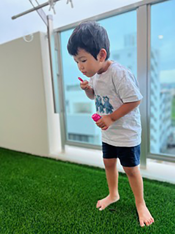 子どもが小学生になるのをきっかけに、マンションを購入しました。前職時代でしたが、当社の熱くならない人工芝と天然素材の塗料を気に入り、バルコニーと子ども部屋の壁に取り入れました。とても快適で満足しています。
