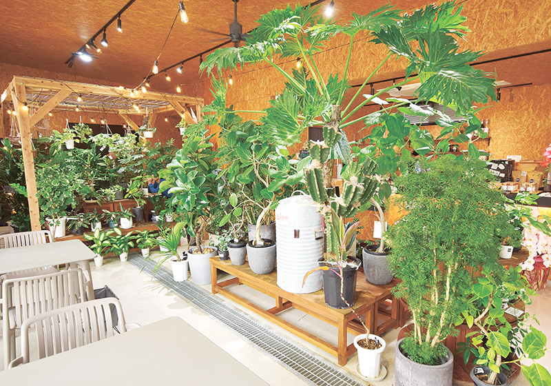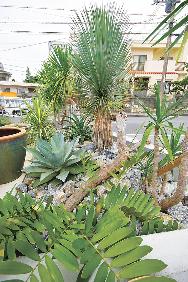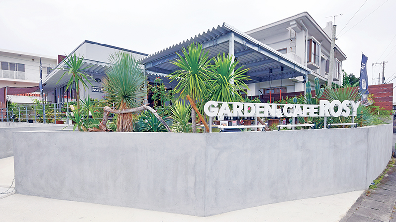 ユッカやアガベなどダイナミックな植物と石材を組み合わせたドライガーデンが目印。ことし10月、糸満市武富にオープンした「ガーデン&カフェ ROSY」は、植物やガーデン雑貨などを販売するカフェ。店内にもテラスにもグリーンがいっぱいだ。