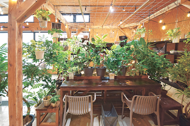 店内にならぶ植物は商品であり、インテリアであり、間仕切りでもある。「ゆっくり見ていただけるよう、植物スペースとテーブルスペースを分けています」と今村さん