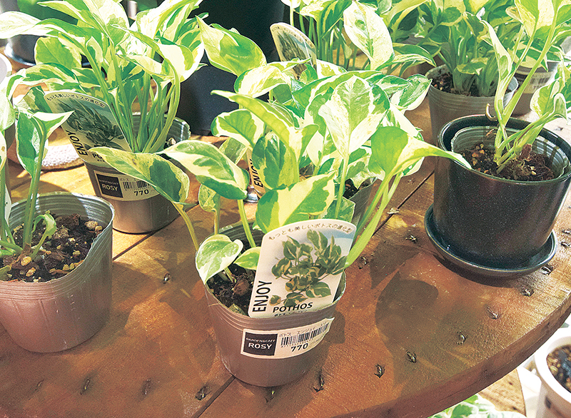 売れ筋はポトス。一口に「ポトス」といっても、たくさんの種類があるが、「ポトスエンジョイ」は「白と緑のコントラストがかわいらしく、インテリアとしても人気。光が少ないと白い部分が減るので、明るめの場所で育てることをお薦めします」とスタッフの友利萌那さんは説明する。