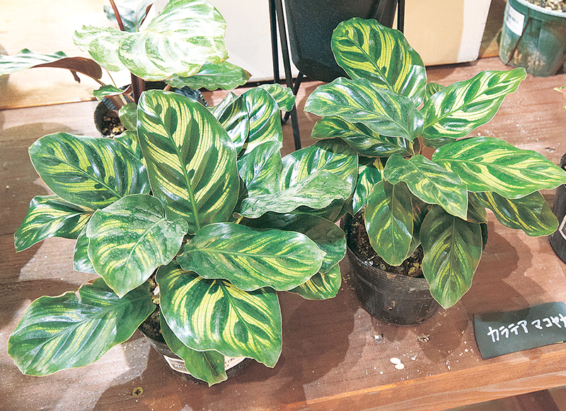 葉の模様がはっきりとした「カラテア」もファンが多い。中でも「カラテア マコヤナ」は、クジャクの羽のような模様で、表は緑色だが、葉裏は紫色という〝リバーシブル〟で人気が高い。「カラテアは、夜になると葉を閉じ、昼になると葉を広げる『休眠運動』の習性があります。そのため葉の裏表の両方を見ることができ、とても面白いですよ。湿度の高い環境を好むので、そばにコップ一杯の水を置くなどするとイキイキ成長します」とアドバイスした。