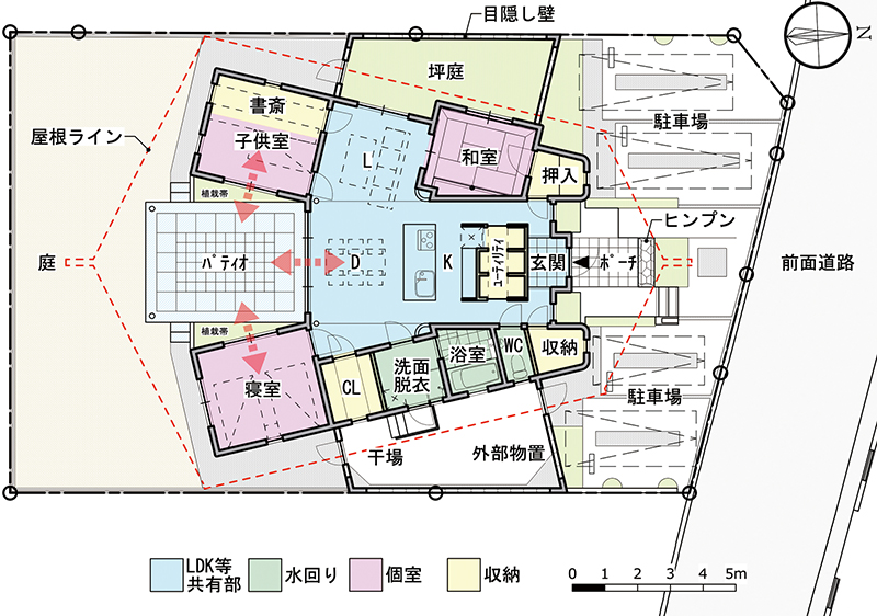 建物外部は4台分の駐車場を確保し、室内から緑を楽しむ坪庭や干し場は目隠し壁で囲んで建物のプライバシーを確保している。