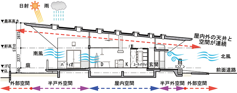 LDKとパティオを中心に両側に各部屋が並ぶ。パティオは屋内と外部をつなぎ、日差しや雨をさえぎり、室内に風を取り込める。多目的に使えるこの空間が快適な住環境を生む