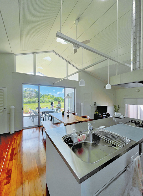 深い屋根がかかったパティオは雨や日差しを遮る心地よい木陰の空間で、室内と比べるとコストもかからない。イスやテーブルを置きBBQや食事を楽しむなど、多目的に活用できる。また、パティオを南側に設けることで、大きな窓から夏場は心地よい風が建物内部を通り抜け、冬場は北風を防ぐ間取りになっている。住宅は部屋数や広さばかりを気にしがちだが、半戸外の空間は生活の楽しみ方を広げ、非日常なリゾート気分を味わえるぜいたくな空間である。Aさんもこうした使い方に魅力を感じてくれた。