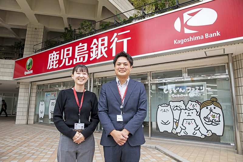 鹿児島銀行新都心支店の久保優香さん(26)と沖縄支店の東郷開斗さん(25)。「今秋に取り扱いを開始した連生団信や土日を含む柔軟な相談体制など、沖縄のお客さまにより選んでいただきやすい住宅ローンを目指しています。まずは気軽にご相談ください」と話す。