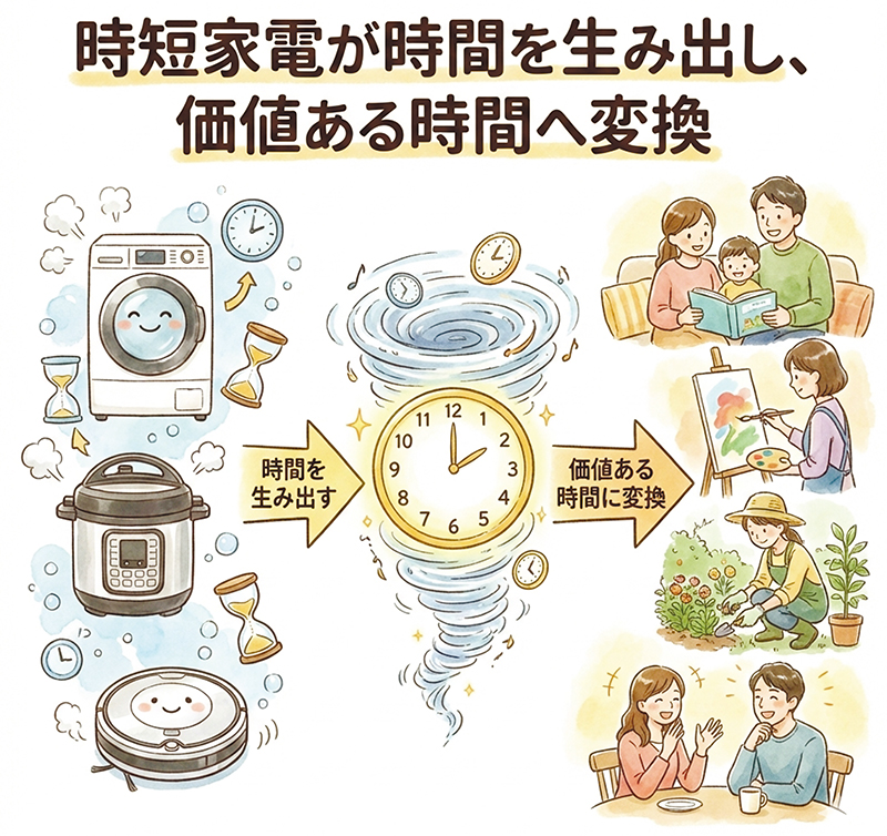 代表例が「時短家電」です。洗濯乾燥機、自動調理機、自動掃除機、食洗器など、家事を助けてくれる家電は数多くあります。