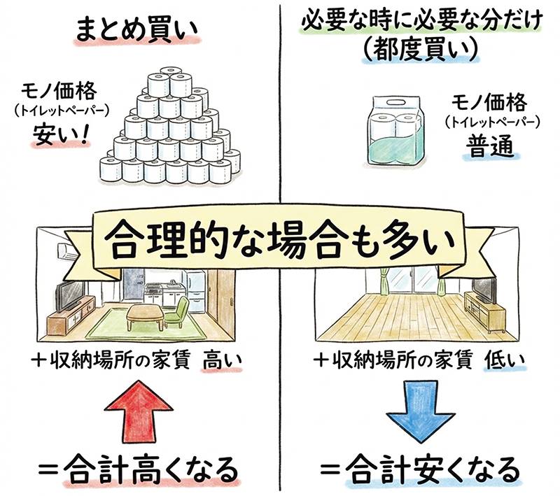 実は、収納スペースにも「家賃」がかかっています。保管場所、管理の手間、探す時間を考えると、必要な分だけ購入する方が、合理的な場合も多いです。