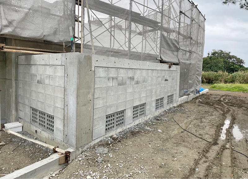 建物の外周りでは駐車場やアプローチ、ブロック壁、フェンスや砂利敷きなどの外構工事が進む。坪庭を囲むブロック壁は光を取り込みながら外からの視線を遮り、強い風から植物を守る役割もある。壁面の一部に花ブロックを使い、表情を持たせることで圧迫感を和らげる工夫もした。砂利敷きの施工前に、防草シートを敷きたいとAさんから要望があり、自身で購入して施工する事で予算を抑えた。