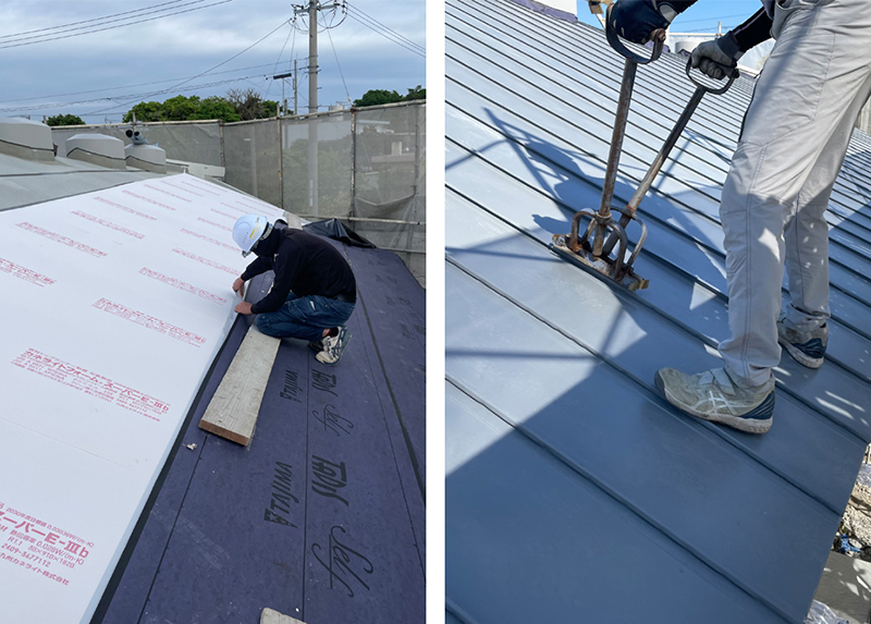 右:屋根材の鉄板を手作業で折り曲げてつないでいく