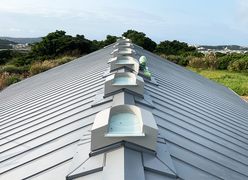 屋根の鋼板ぶきはコンクリートスラブの上に断熱材を敷いて防水シートを貼り、その上から鋼板で覆う外断熱の工法だ。外断熱はスラブの下に断熱材を張る内断熱工法と比べて断熱性能が高い。沖縄の夏場は上からの日射量が多いので、屋根の外断熱は特に効果的だ。鋼板ぶきは見栄えも良く、コンクリートを保護し、建物の長寿命化にも繋(つな)がる一石二鳥の仕上げである。