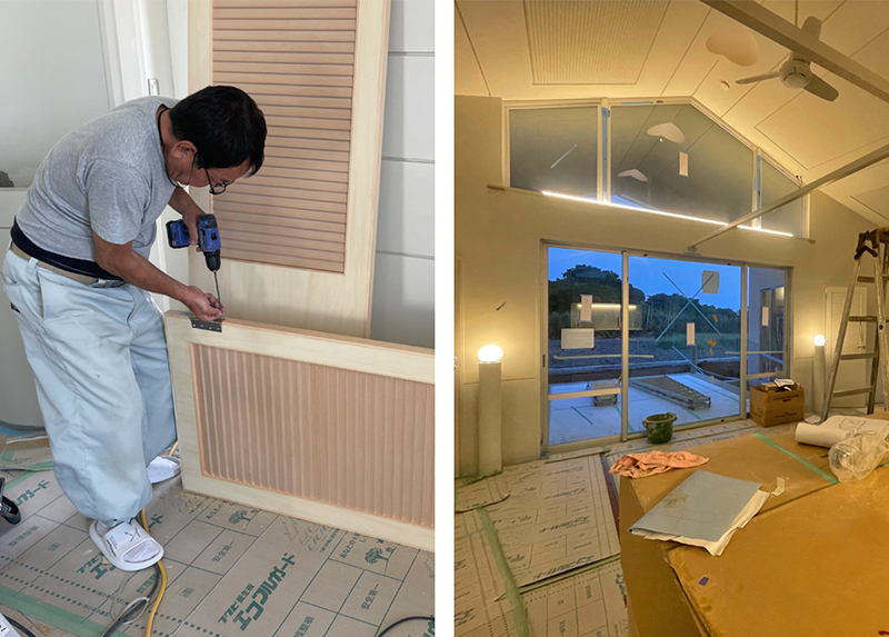 左:工場で造ってきた木製建具を現場に取り付けていく