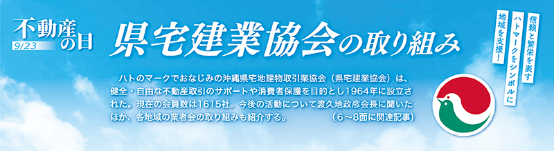 ハトのマークでおなじみの沖縄県宅地建物取引業協会(県宅建業協会)は、健全・自由な不動産取引のサポートや消費者保護を目的とし1964年に設立された。現在の会員数は1615社。今後の活動について渡久地政彦会長に聞いたほか、各地域の業者会の取り組みも紹介する。