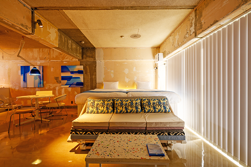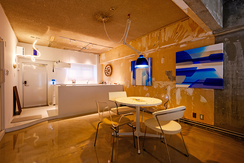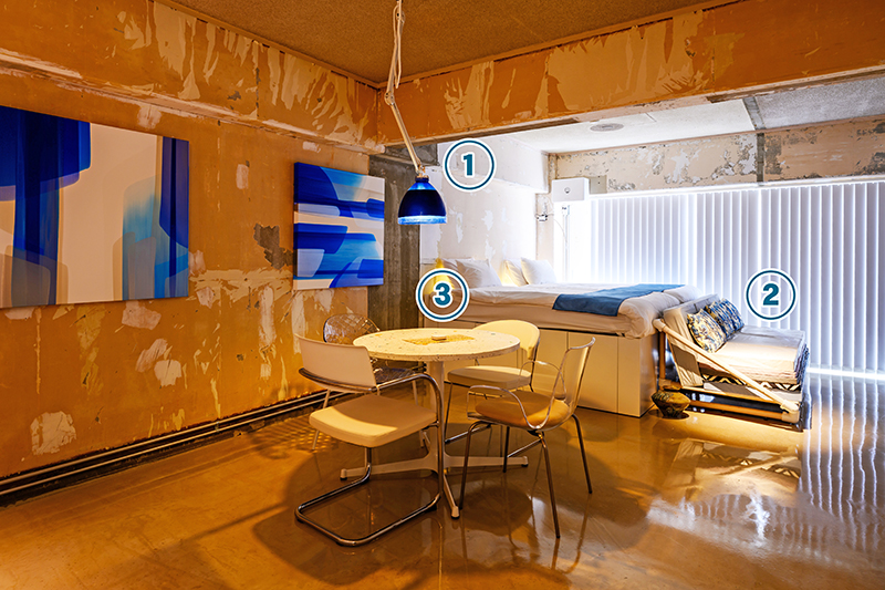 既存の持ち味を生かしたワンルームに、自社で設計・制作した照明や家具などが彩りを添える。テーブルは、琉球ガラスの破片や貝殻、珊瑚砂などをアクセントに利用し、ダイニングの照明は「漂着ごみの浮き」を使って作った。青をベースにし、リゾート感を演出する。
