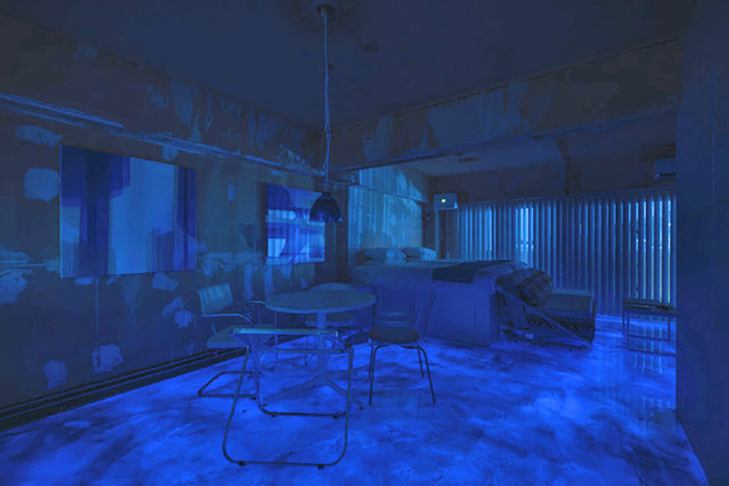 家具やアクセント照明、インテリアは青を基調にした。2枚の絵画はこの空間のために美術家の中島麦さんが制作したもの
