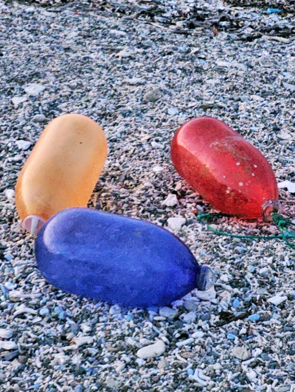 ①ダイニングのアーム式ペンダント照明は、漂着ごみとして廃棄される漁業用の浮きを活用した。「kapokの事務所にあったライトが格好良かったので、浮きを譲ってもらって作成した」。(写真はkapok提供)