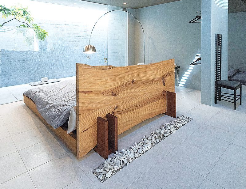 ベッドのヘッドボードは、リビングで活用していた琉球松の天板を再利用。ボード裏の床にはサンゴ混じりの石を置いて、夏の日の思い出をさりげなく演出
