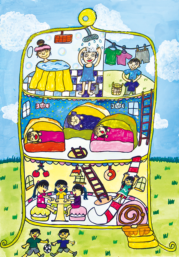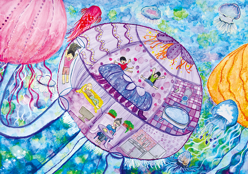 ◆くらげをモチーフにしたアイデアに海の深さを感じます。パステルカラーが付け足され、透けた感じの絵は沖縄の海の癒やしがたっぷり感じられます。壁の模様もすてきです。ベッドもぐっすり眠れそうなデザインですね。すぐに生かせそうです。くらげの足でくらげをつなぐ発想で部屋をつなぐのも楽しいですね。笑顔で暮らす家族が海の中で楽しく行き来できそうです。全体の青い色合いと緑・紫の使い方が高学年らしく素晴らしいです。おめでとうございます。(金城)
