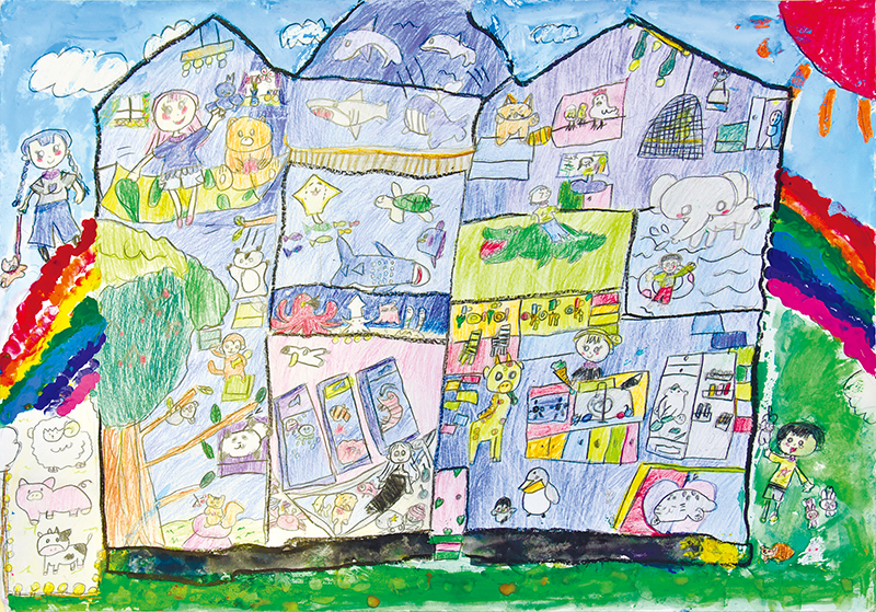 わたしはどうぶつが大すきだから、どうぶつたちとあそべるお家をかきました。だけど、日本にいるどうぶつだけじゃさみしいので、せかいのどうぶつもかきました。ベッドには魚がすいすいおよいでいて、その上はすいぞくかんよりもキレイな魚が見られます。この絵でしょうがとれて、とてもうれしいです。