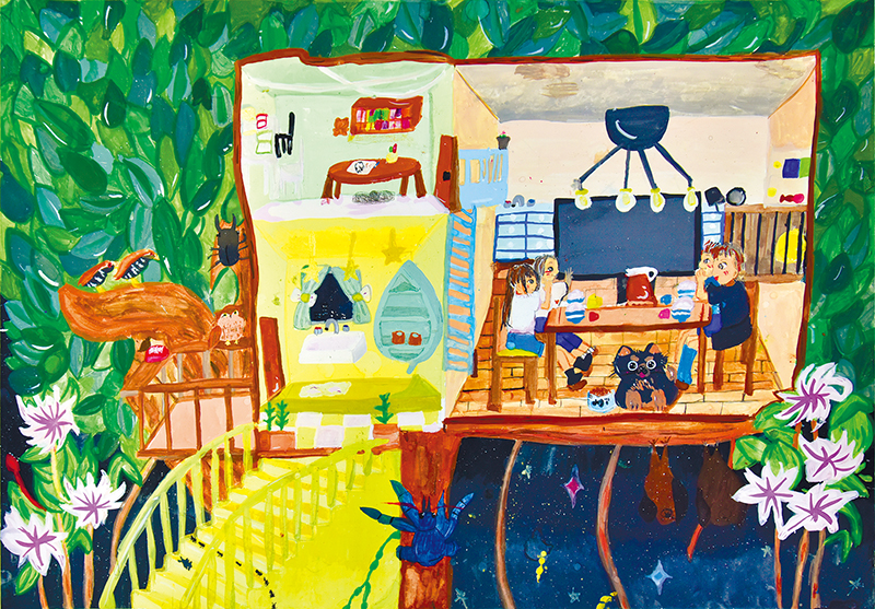 動物、生き物の好きさが存分に伝わる。ヤンバルクイナやフクロウ、ヤシガニ、昆虫、草花がちりばめられ、自然や生き物に囲まれて過ごす理想の生活は、楽しそうだ。森の生き物の特性をとらえ、時間を夜に設定したこだわりも素晴らしい。家具や照明、部屋の奥行きもしっかりと描れていて、こんな家に住みたいという気持ちが表現されている。(宮城)