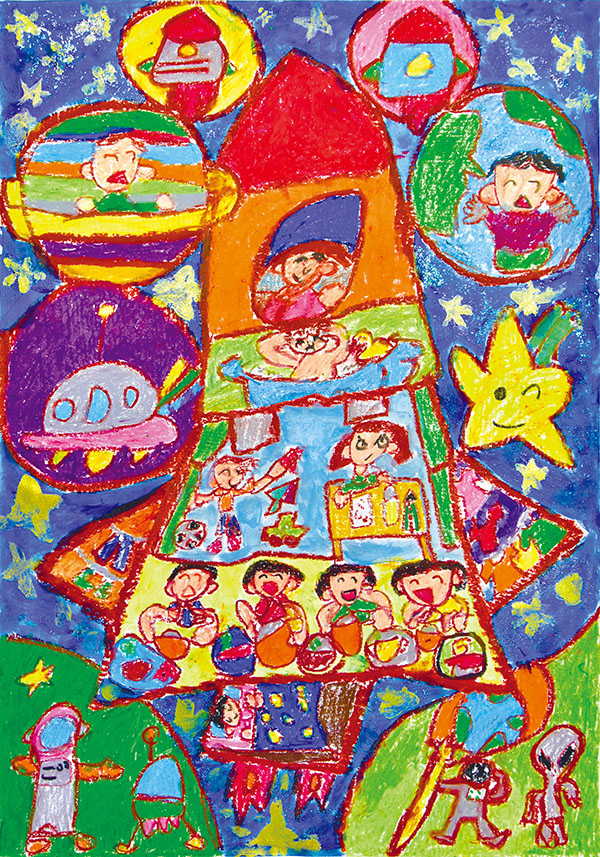 ロケットのおうちで、かぞくみんながごはんをたべたり、あそんだりできるへやがあったらおもしろいと思ってかきました。がんばったところは、さいごまできれいに色をぬったところです。いっぱいじかんをかけてかきました! たくさんの人に見てほしいです! しょうがもらえてよかったです!