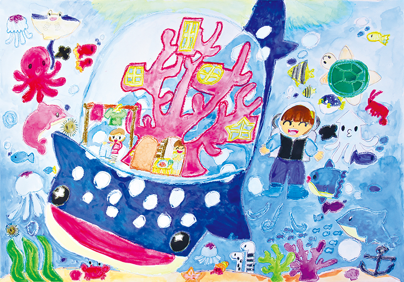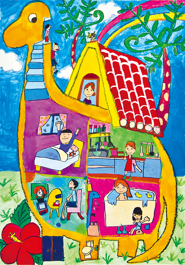 体全体を家にして住みたいほど、きょうりゅうが大好きで、ずっと一緒にいたいという気持ちが感じられる。南国の花や、背中にある赤瓦の屋根は沖縄らしさを表現したのも良かった。体内に描いた家族の暮らしぶりも細かく表現され、階段を上って首のスロープを滑り降りる姿など、楽しく過ごしたいとの思いが絵全体から伝わってくる。(宮城)