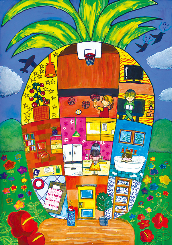 私はパイナップルが大好きで、沖縄の特産品でもあるので、モチーフにしてこの家を描きました。工夫をした所は、必要な日用品は全て描くようにし、色使いに気を付けました。