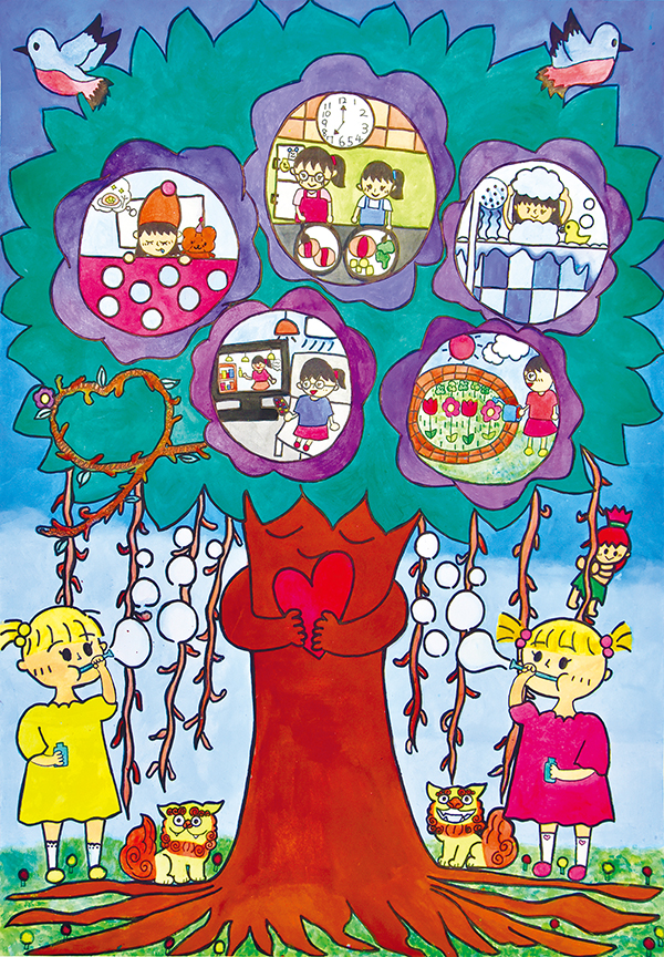 ハートを抱いているガジュマルの顔がとても印象的で心に響きました。ツルをハートにするアイデアも素晴らしく、花言葉がとてもすてきで、花の中に幸せな家族の姿が描かれています。おちゃめな精霊キジムナー、家の守り神シーサー、鳥のスーサーなど、絵の構成力にも優れており、とてもウチナーらしい絵です。私もぜひ、幸せなガジュマルツリーハウスに住んでみたいですね。(山城)