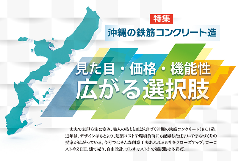 丈夫で表現方法に富み、職人の技と知恵が息づく沖縄の鉄筋コンクリート(RC)造。近年は、デザインはもとより、建築コストや環境負荷にも配慮した住まいやまちづくりの提案が広がっている。今号ではそんな創意工夫あふれる5社をクローズアップ。ローコストやZEH、建て売り、自由設計、プレキャストまで選択肢は多彩だ。