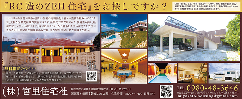 県 内北部を中心に、一戸建て住宅やヴィラ、店舗の建築工事、型枠・鉄筋工事事業を行う(株)宮里住宅社は、RC造のZEH(ゼッチ)の注文住宅も手がけている。ZEHとは、高断熱化や省エネ設備の導入でエネルギー消費を抑え、太陽光発電などの再生可能エネルギーで、年間のエネルギー収支を実質ゼロ以下にする住宅のこと。同社代表取締役の宮里新太さんは「ZEH住宅の一番のメリットは、ランニングコストを抑えながら快適で安全に暮らせる事です」と話す。「2017年に自宅としてRC造のZEH住宅を新築しました。当時はZEHが普及したばかりで手探りでプランを考えましたが、夏はエアコン1台で家全体が涼しいです。オール電化なので光熱費の削減も実感しています。RC造は頑丈なので災害にも強く、安心して生活できます」と語る。その一方で、「夏場に特化しすぎたので冬は寒く、基礎部分も断熱をした方が良いと分かりました。実際に建築し、住んでみたからこそ分かった課題を反映して現在は設計をしています」