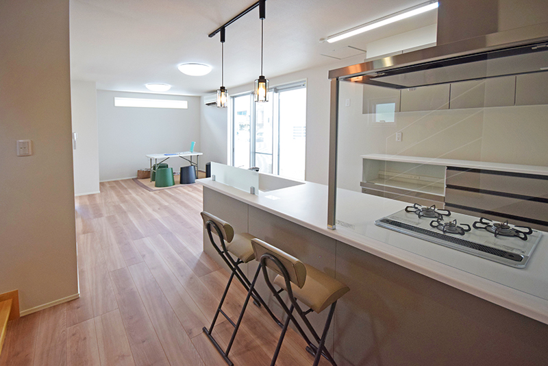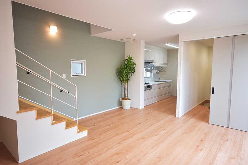 2棟とも敷地の形は同じだが、間取りや内装は大きく違う。同社の山崎千菜美さんは、「1号棟は北欧テイスト。ナチュラルな木やグリーンを基調にしてやわらかい雰囲気にしています。間取りはキッチンが半個室になっていて、周りを気にせず料理に集中できます」と説明する。2号棟はグレーを基調にしたスタイリッシュな空間。「LDKは横並びで家事動線が短く、最近人気の間取りです」