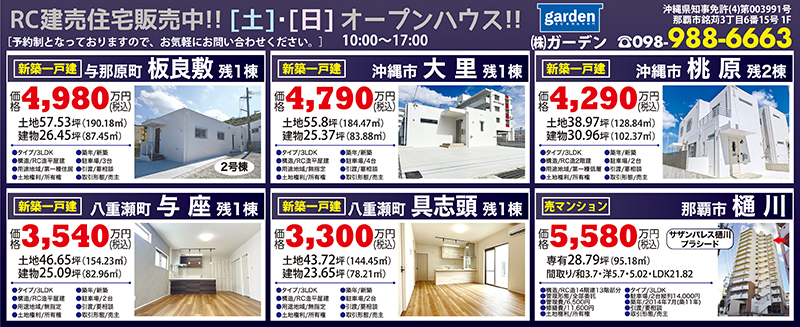 現在、沖縄市大里、八重瀬町与座、宜野湾市長田でも分譲中。「最近では、建築中の現場で『ガーデンの物件?』とお声掛けいただき、成約に至ることもあります。2008年の創業から建売にこだわり、県内で300棟超を建築してきた実績が信頼に結びついている。これからもお客さまの要望にアンテナを張り『自由設計のような建売』を目指します」と話した。