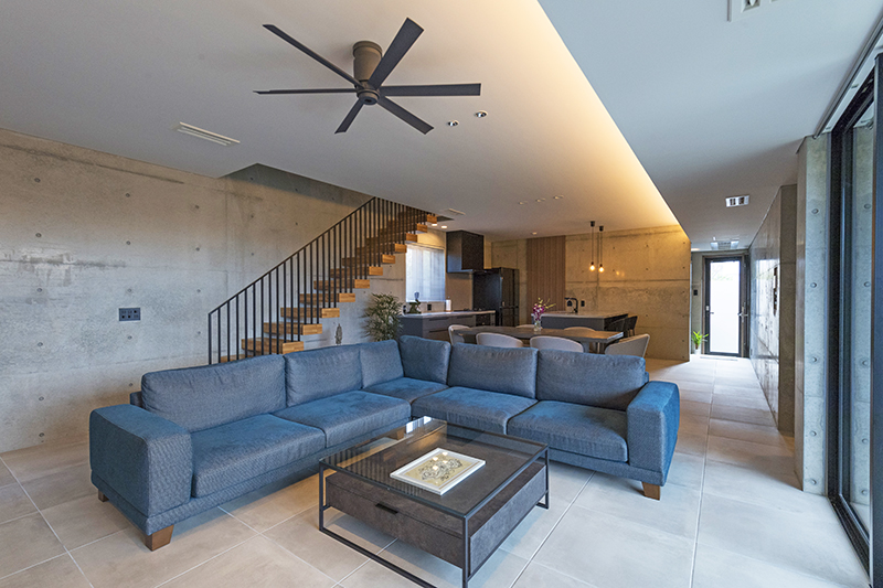 住宅北側には、戦闘機の大きさがほぼ等身大で確認できるほど、米軍基地が隣接。上空を戦闘機が飛び交うのは日常茶飯事だが、「騒音が全く気にならず、静かな空間で過ごせています」と満足げ。近くに暮らす親族が訪れた際には「本当に信じられない」と驚くほどの静けさだ。Dさん夫妻は「人生で一戸建てに暮らすのは初めて。静けさに加え、こだわったコンクリート打ち放しのエレガントな質感や快適な広さもお気に入り。より人間らしく生活を送れています」とうれしそうに話す。