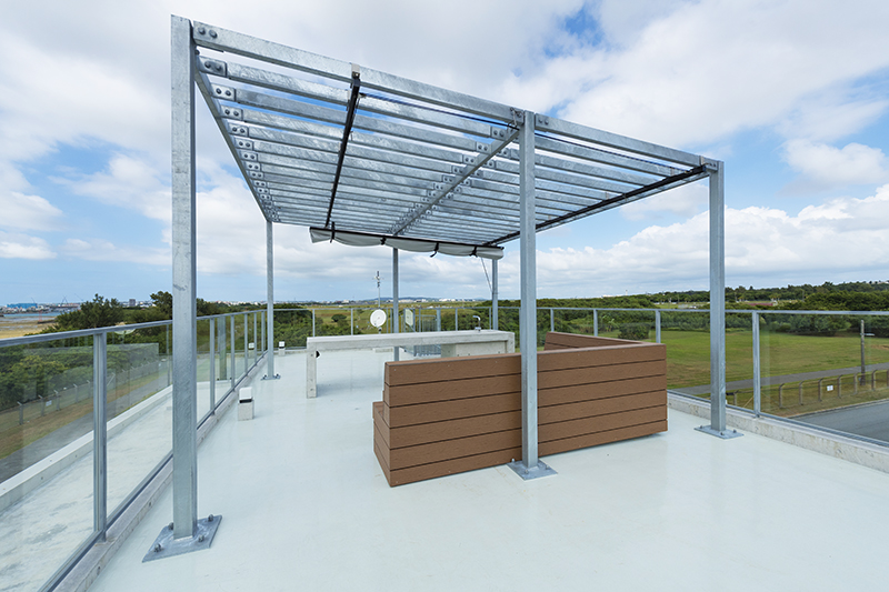 屋上テラスからは米軍基地や西海岸の景色が視界いっぱいに広がる。鉄骨にテントを張り、造作したコンクリートのキッチンや木ベンチなどでバーベキューを楽しむこともできる