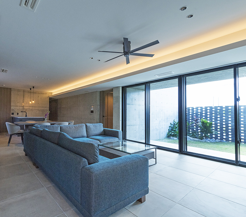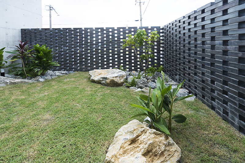 コンクリート打ち放しの外観は仕上げを変えながら、中庭の目隠しにレンガを採用。外構・中庭に植栽を施し、「外からのプライバシーは守り、室内からは広がる緑を楽しめます」。Dさん一家の要望から中庭はライチの木を中心に、バランスを考えた石組みで奥行きと立体感を演出。室内は一家の好みに合わせて、キッチンカウンターは造作し、ソファなどのインテリアをバランス良く配置した。