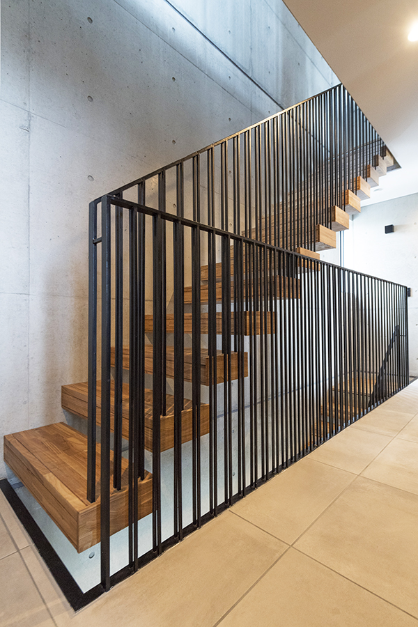 スケルトン階段。細く黒いアイアンの手すりが軽やかにのび、建築要素もインテリアに取り込んでいる