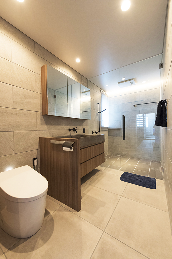 西洋スタイルの水回り。タイルを基調に高級感あふれる仕上げとし、洗面台などは造り付けた