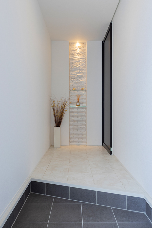 グレーと木目調の外観は、温かみと上質さを兼ね備えた洗練された印象を受ける。アプローチの浮き階段を上り玄関扉を開けると、白を基調とした玄関ホールが出迎える。靴箱さえ見えず、生活感を全く感じさせない。