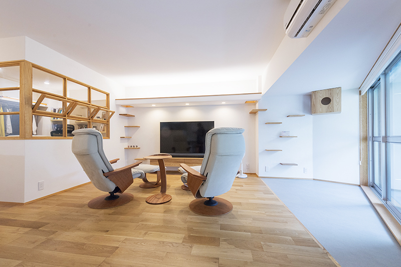 夫妻がくつろぐリビングに、猫の居場所も準備。キャットウオークやステップ、ボックスを設けた。右側のタイル床スペースは「子猫だったときにケージを置いていた」とTさん。左側の書斎とは室内窓でつながる