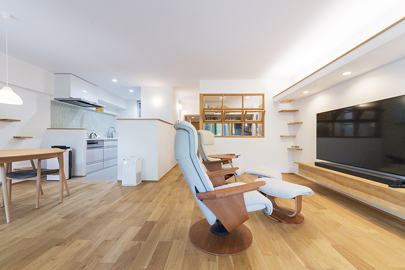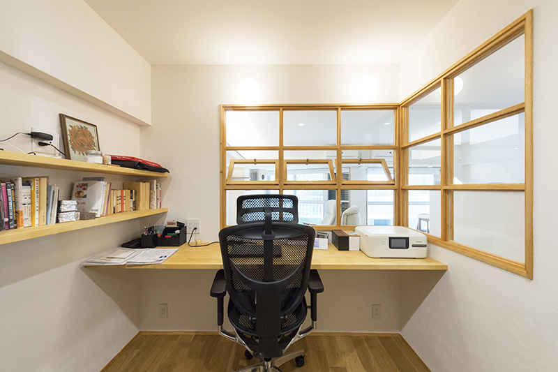 もともとは3LDKだったが、壁を取り払って1LDKに。LDKの一角には書斎を設けた。2面の大きな室内窓越しに、家族の顔が見える造りも気に入っている。