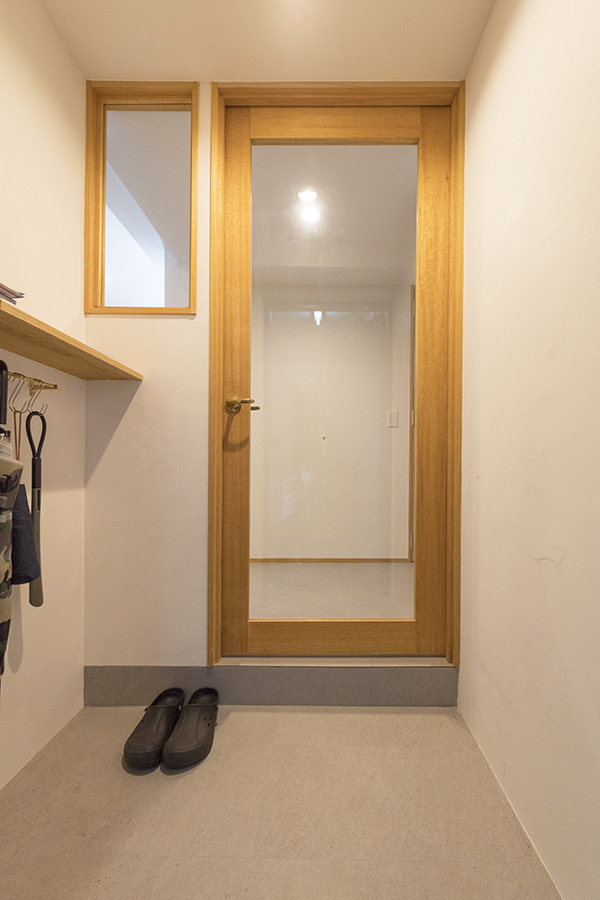 玄関前には、猫の逃走を防ぐためのガラス扉を設けた。閉めつつも、ガラスの面積を大きくして圧迫感を軽減