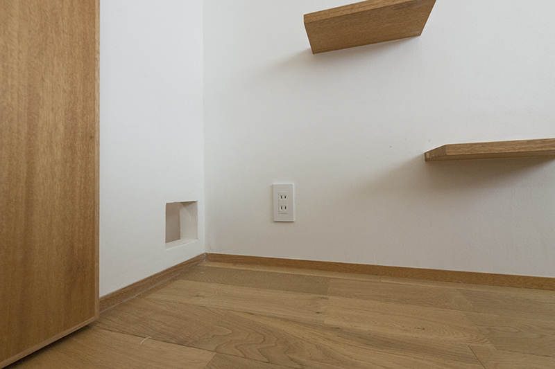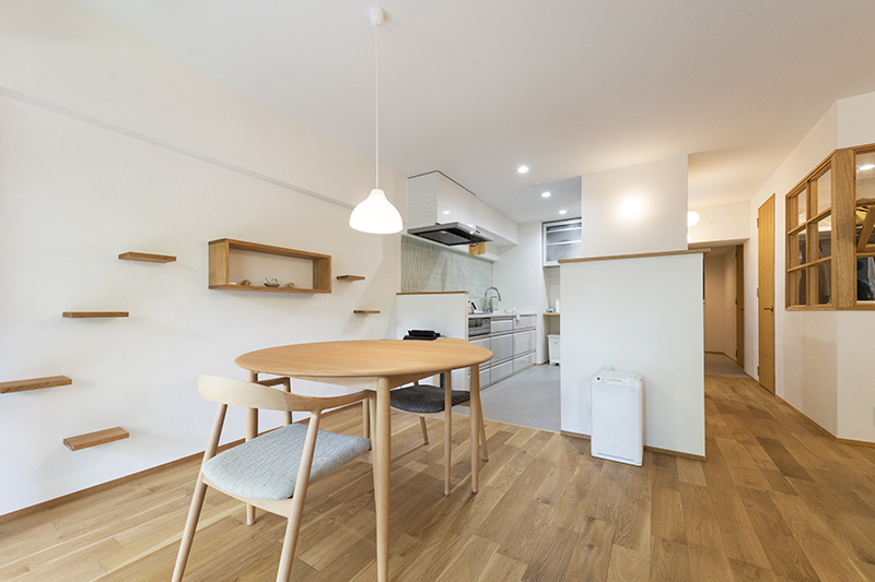 ダイニングの壁にもキャットステップがある。小物を飾るニッチも兼ね、空間になじんでいる