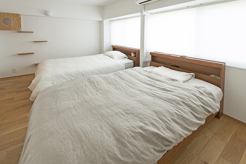 寝室にもキャットウオーク・ボックスがあり、家族そろって就寝。戸を開閉しなくても出入りできるよう専用の「猫穴」も設置